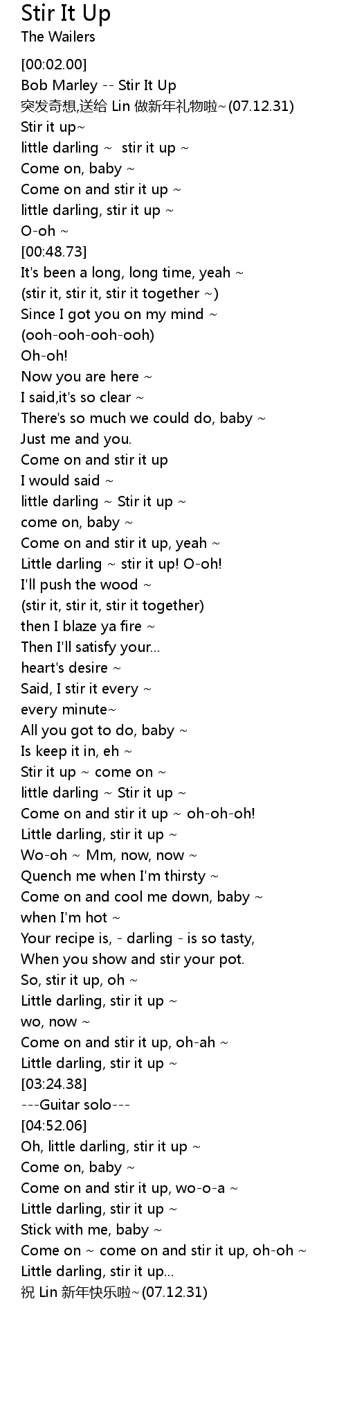 | [02:17.62] | Come on and stir it up ~ oh-oh-oh! |