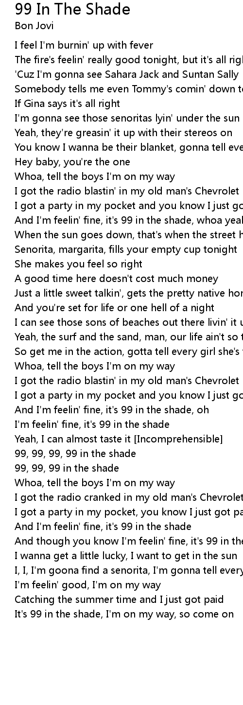 And though you know I'm feelin' fine, it's 99 in the shade |