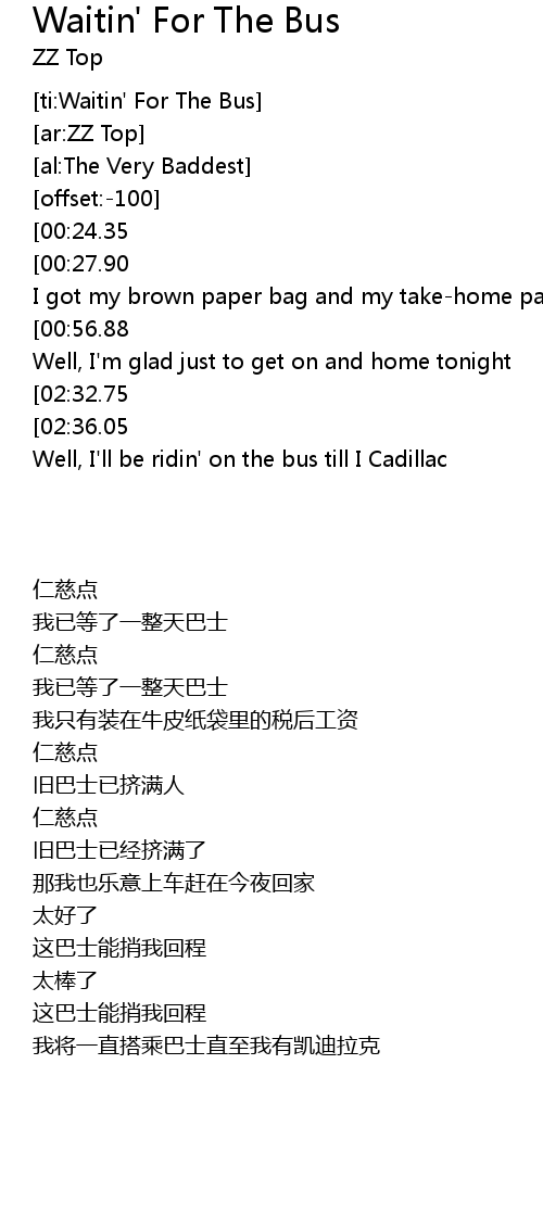 | [00:18.03][00:27.90] | Been waitin' for the bus all day |