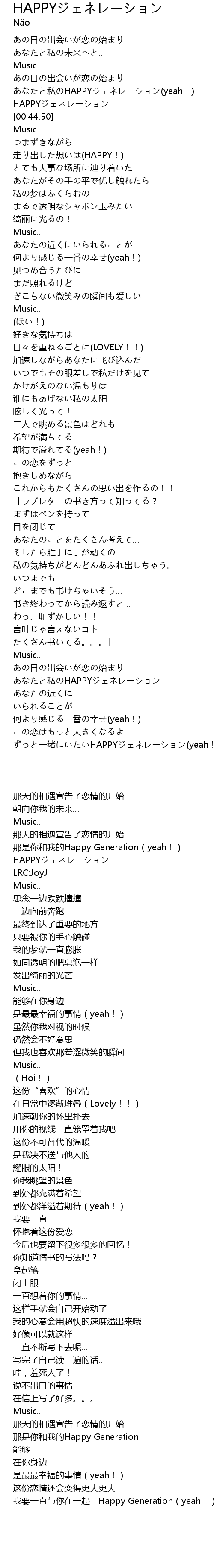 | [00:35.01] | あなたと私のHAPPYジェネレーション(yeah!) |