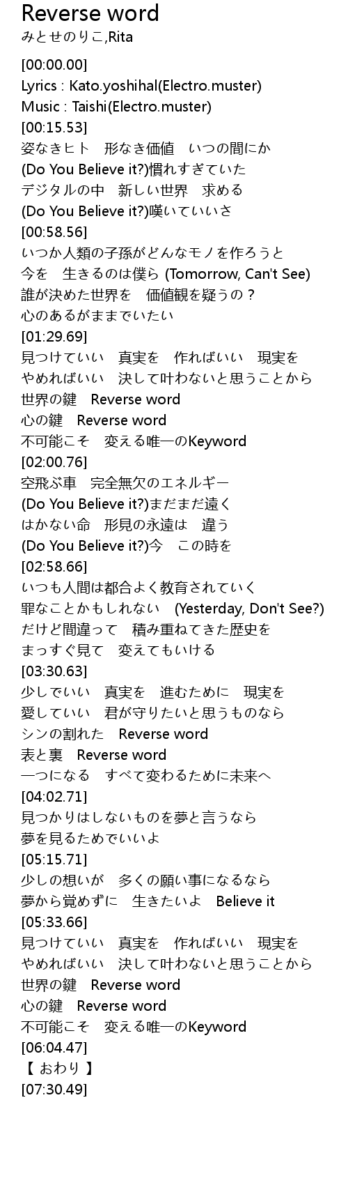 | [00:08.05] | Lyrics : Kato.yoshihal(Electro.muster) |