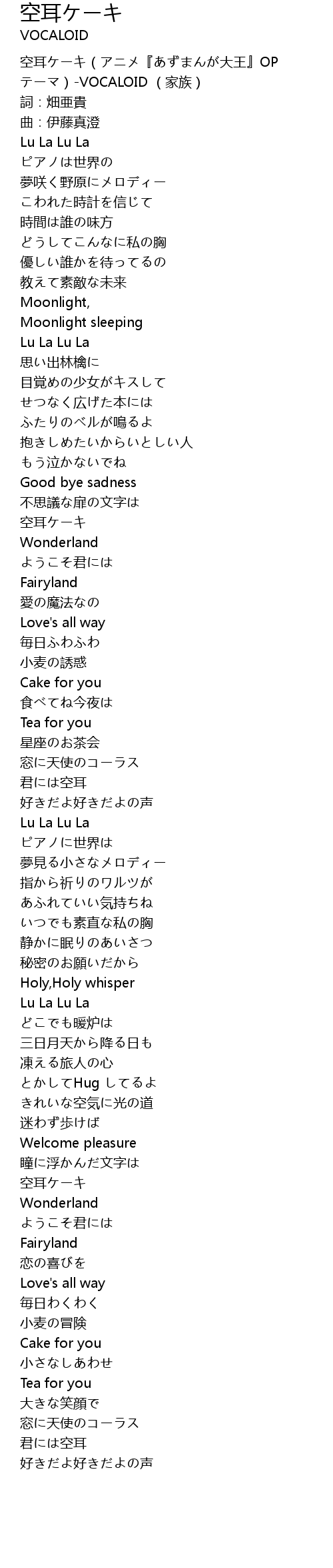 | [00:00.00] | 空耳ケーキ(アニメ『あずまんが大王』OP テーマ)-VOCALOID (家族) |