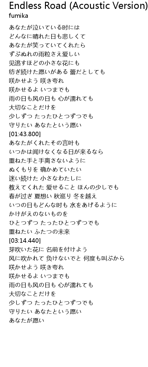 | [02:01.380] | いつかは闻けなくなる日が来るなら |