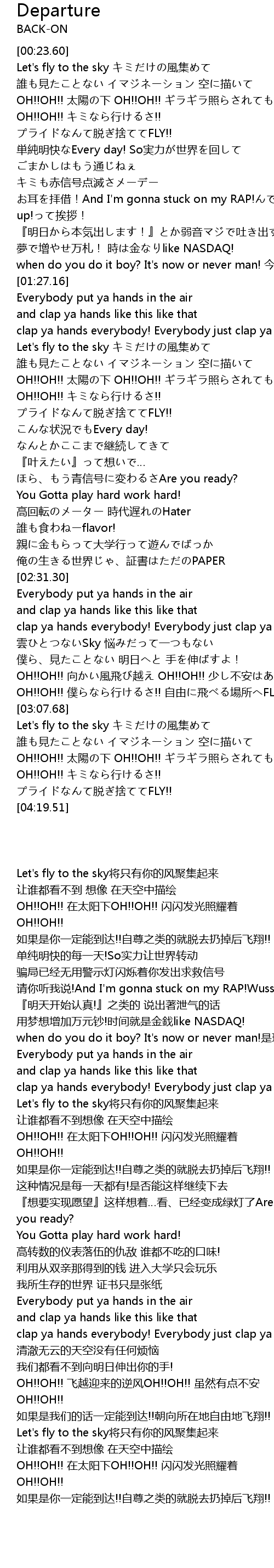| [03:00.25] | OH!! OH!! pú xíng!! zì yóu fēi chǎng suǒ FLY!! |