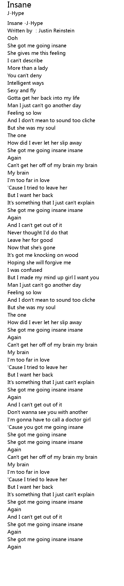 | [01:06.718] | She got me going insane insane |