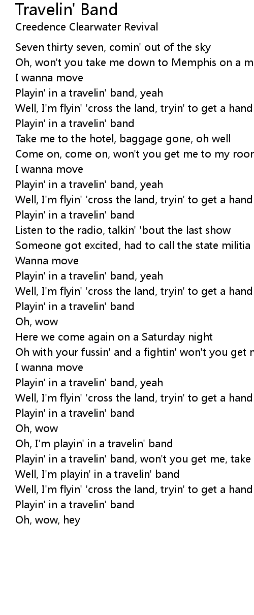 Playin' in a travelin' band, won't you get me, take my hand? |