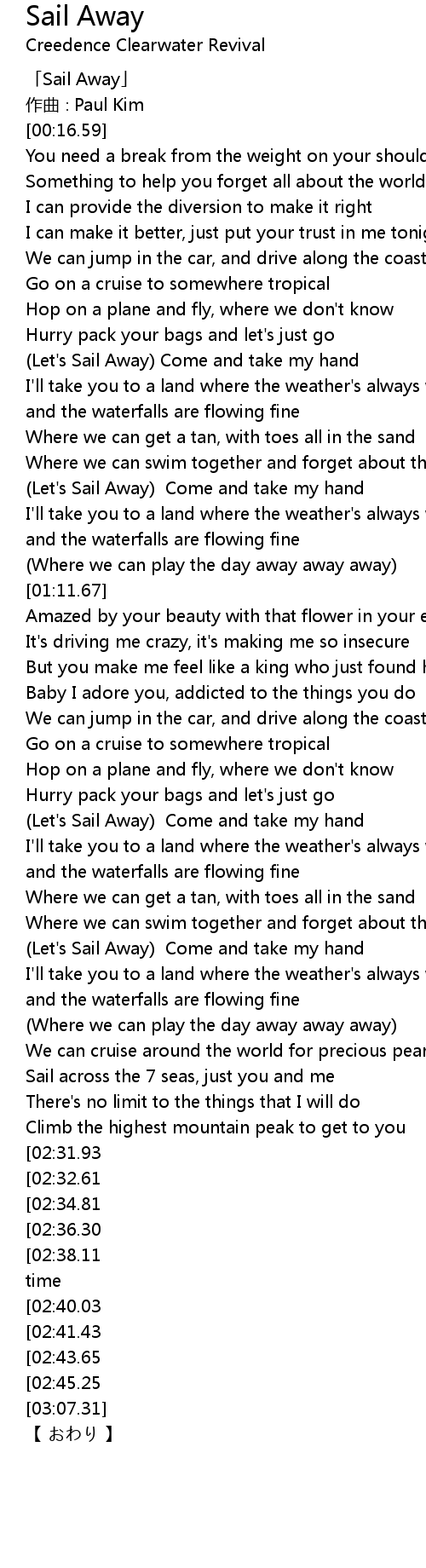 | [02:58.23][02:40.03] | Let' s Sail Away Come and take my hand |