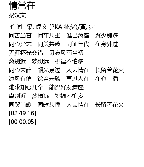| [00:00.00] | 作词 : 梁, 偉文 (PKA 林夕)/黃, 霑 |