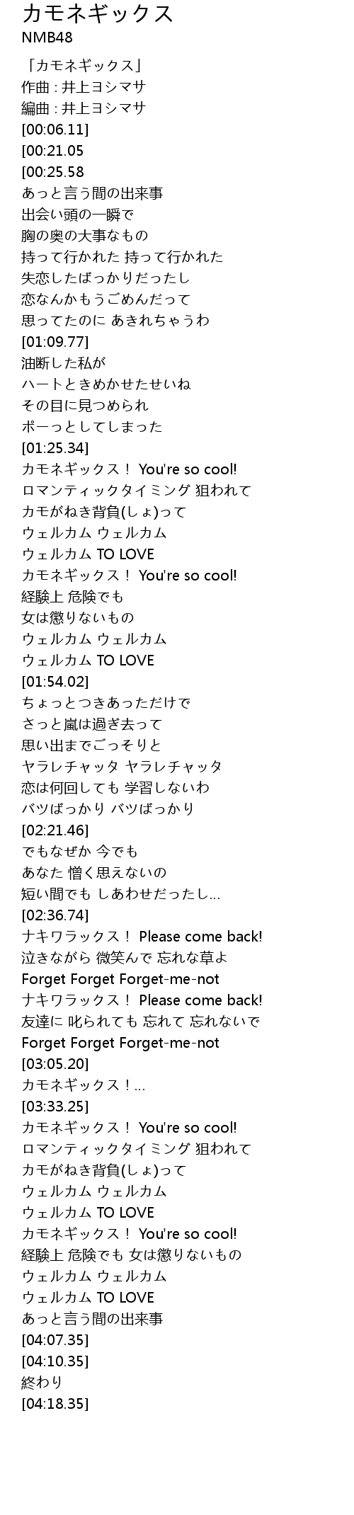 | [00:27.39][00:21.05][00:07.11] | カモネギックス!… |