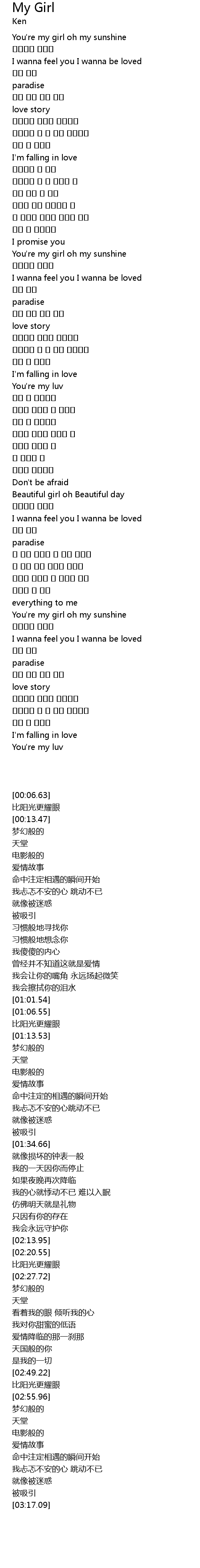 | [00:06.63] | You're my girl oh my sunshine |