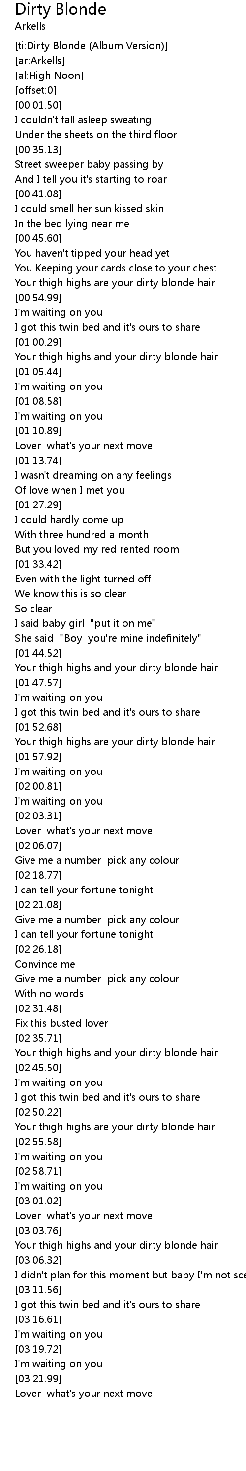 | [03:04.32] | Your thigh highs and your dirty blonde hair |