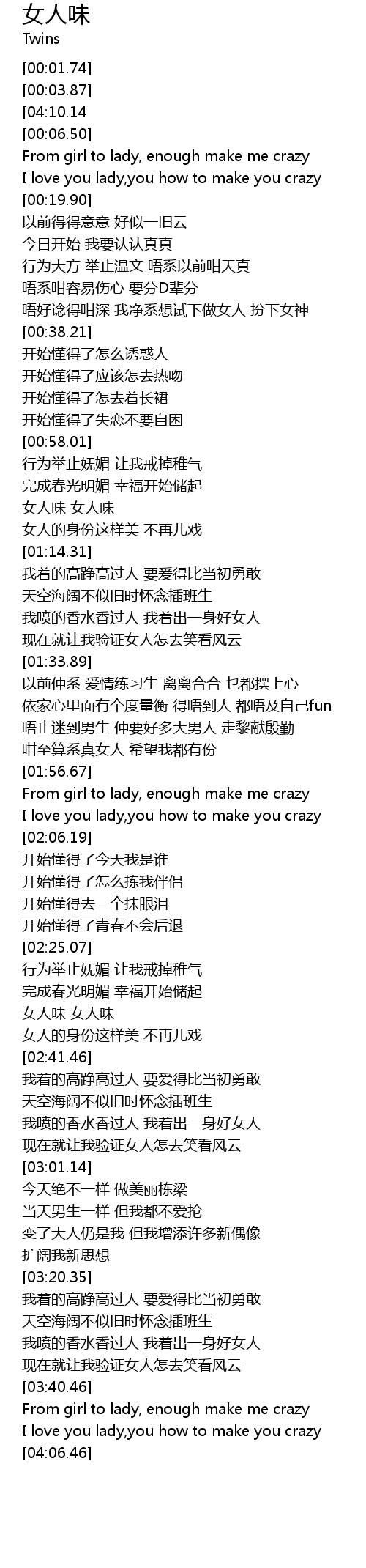 | [01:57.32] | From girl to lady, enough make me crazy |