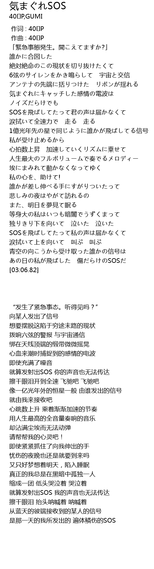 | [02:53.69] | あの日の私が飛ばした 傷だらけのSOSだ |