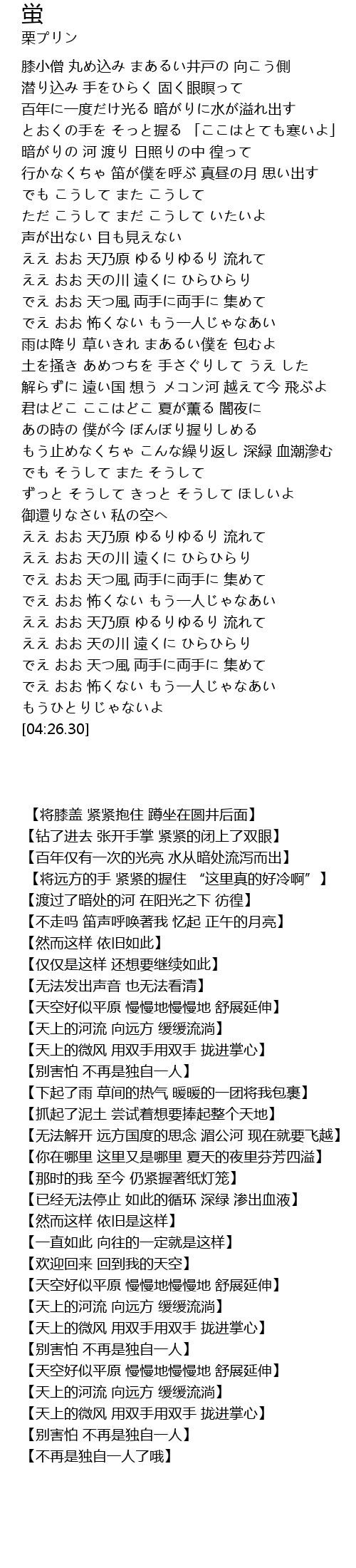 | [01:38.99] | ええ おお 天の川 遠くに ひらひらり |