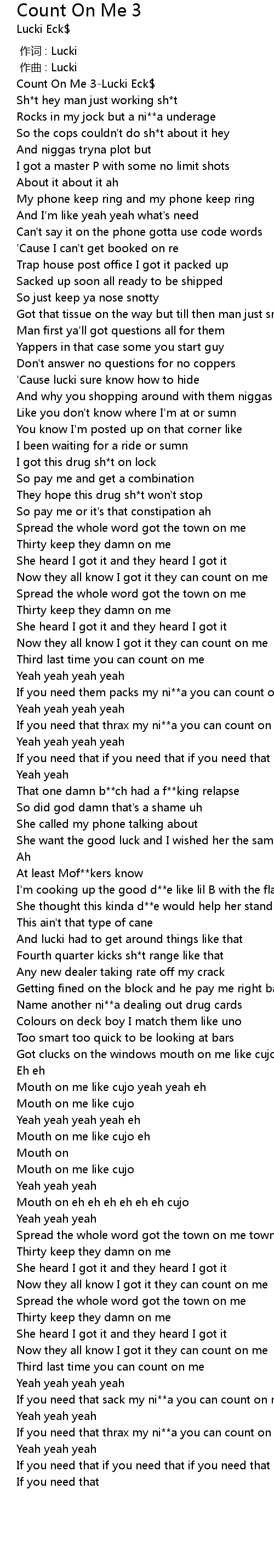 | [03:16.123] | If you need that sack my ni**a you can count on me |
