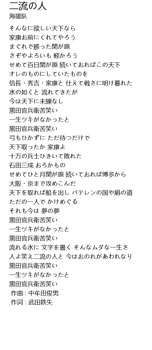 | [03:35] | 人よ笑え二流の人と 今はおのれがあわれなり |