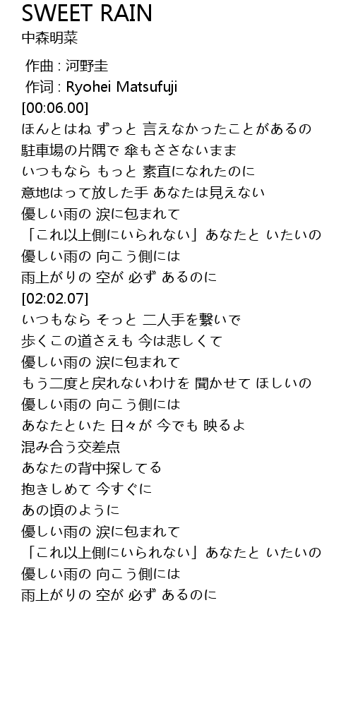 | [03:45.44] | 優しい雨の 涙に包まれて |