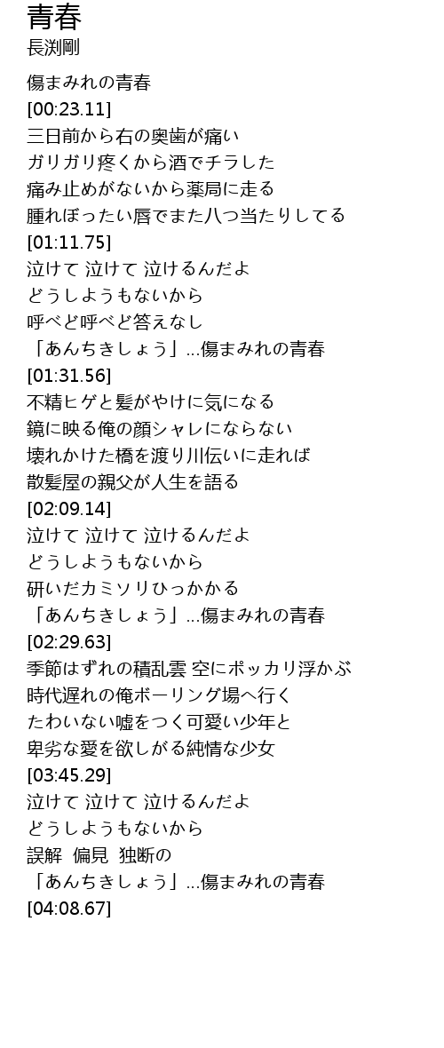 | [00:11.08] | 傷まみれの青春 |