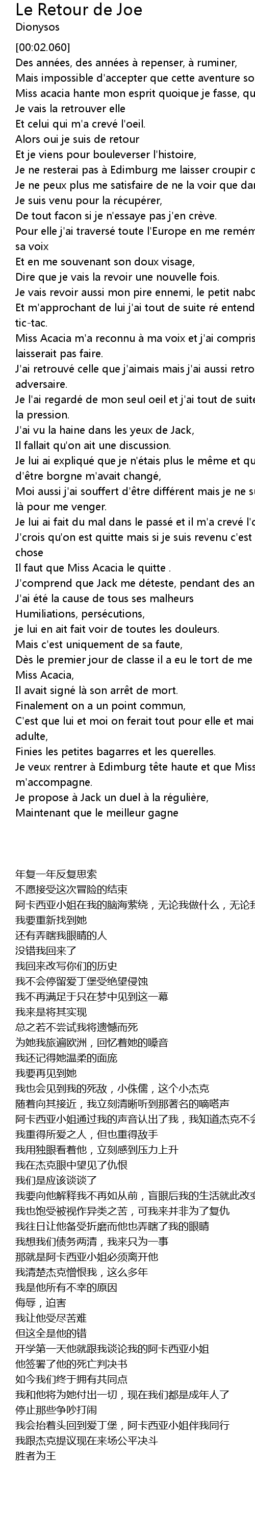 | [01:07.670] | J' ai retrouve celle que j' aimais mais j' ai aussi retrouve mon adversaire. |