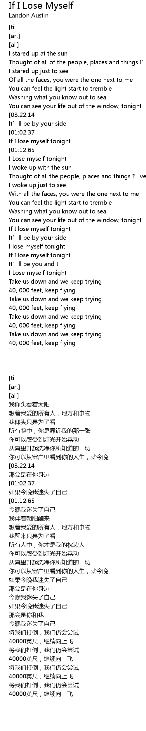 | [03:22.00][03:22.14][00:55.72] | If I lose myself tonight |