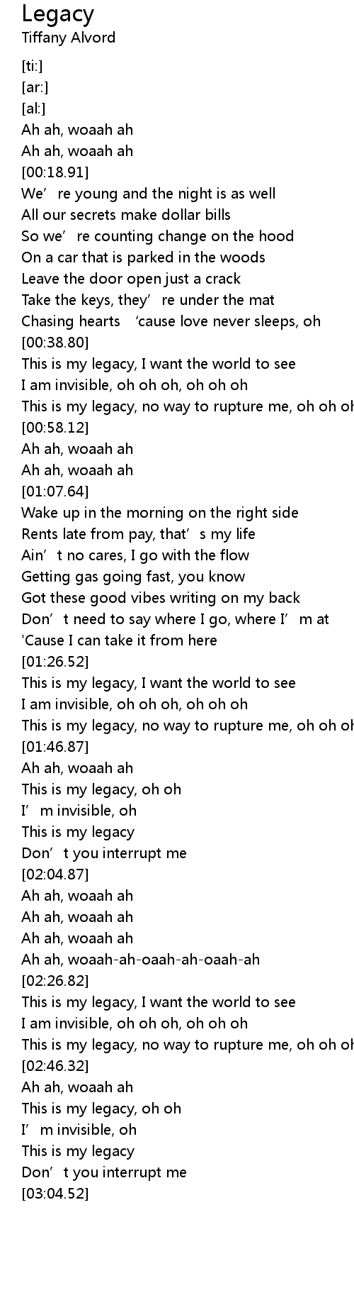| [00:48.53] | This is my legacy, no way to rupture me, oh oh oh, oh oh oh, ooh oh |