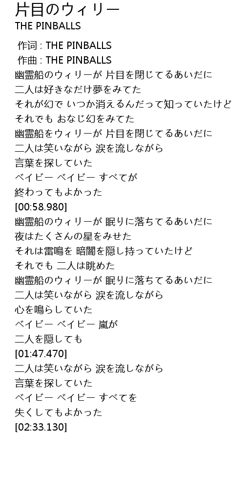 | [00:40.210] | 幽霊船をウィリーが 片目を閉じてるあいだに |