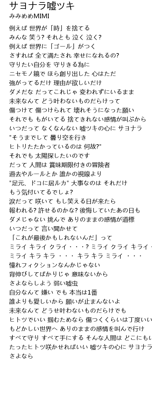 | いつだって なくなんない 嘘ツキの心に サヨナラ | |