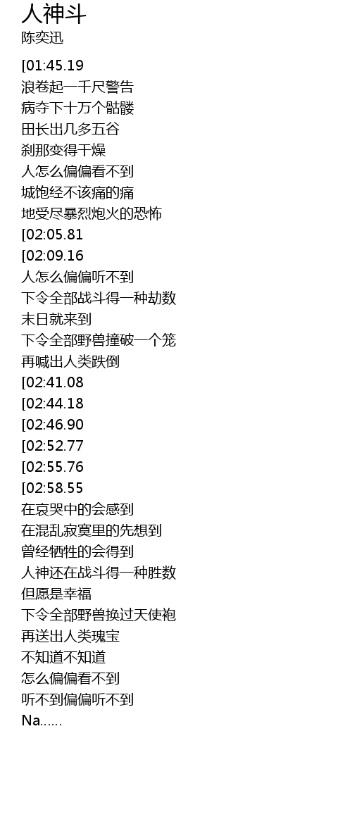 | [00:07.00][01:45.19][03:02.69] | 陈奕迅-人神斗(粤) |