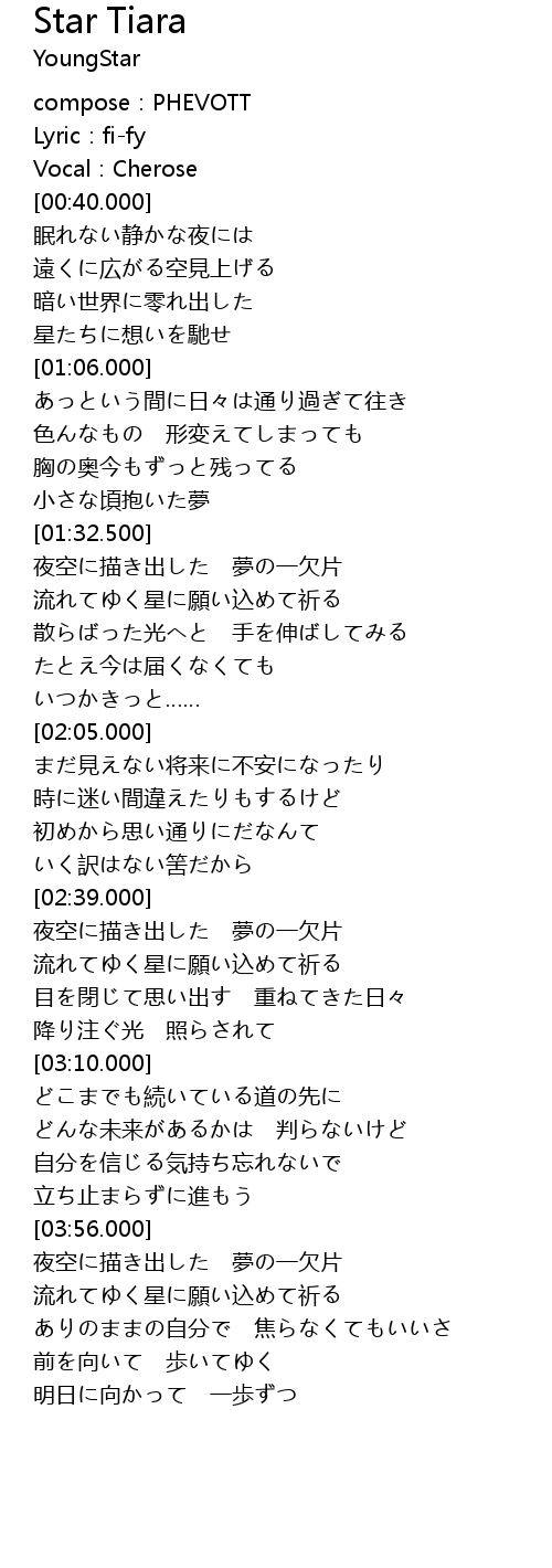 | [03:56.469] | 夜空に描き出した 夢の一欠片 |