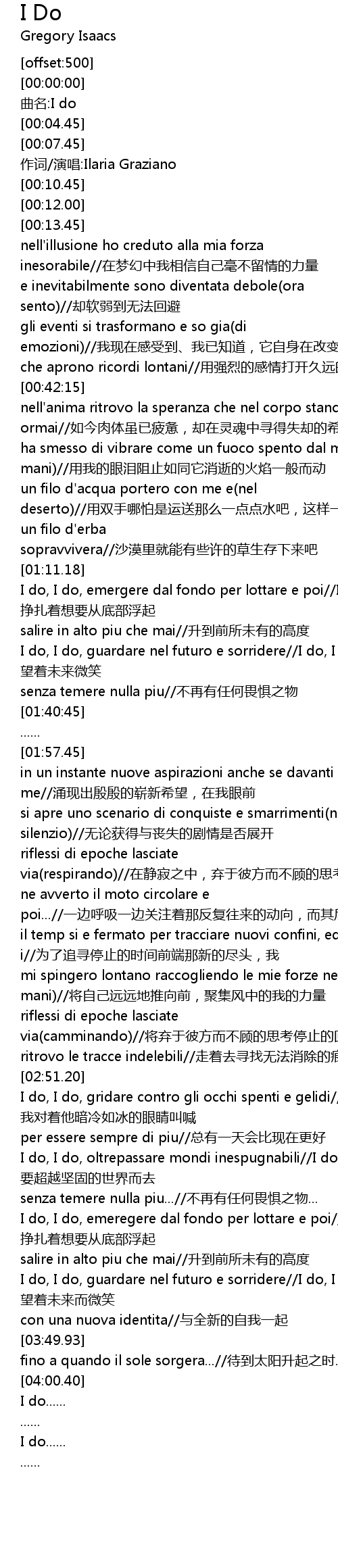 | [03:36.60] | I do, I do, guardare nel futuro e sorridere I do, I do, wang zhe wei lai er wei xiao |