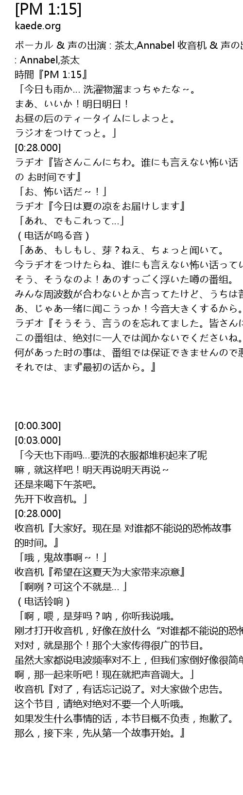 | [00:35.000] | ラヂオ『皆さんこんにちわ。谁にも言えない怖い话 の お时间です』 |