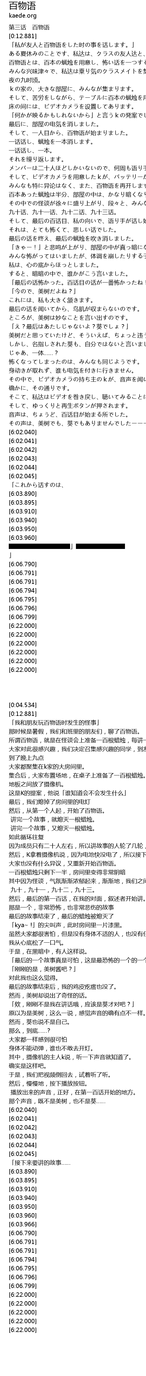 | [0:30.703] | 百物语とは、百本の蝋烛を用意し、怖い话を一つするたびに、蝋烛を吹き消すと言う、怪谈会のやり方なのだそうです。 |
