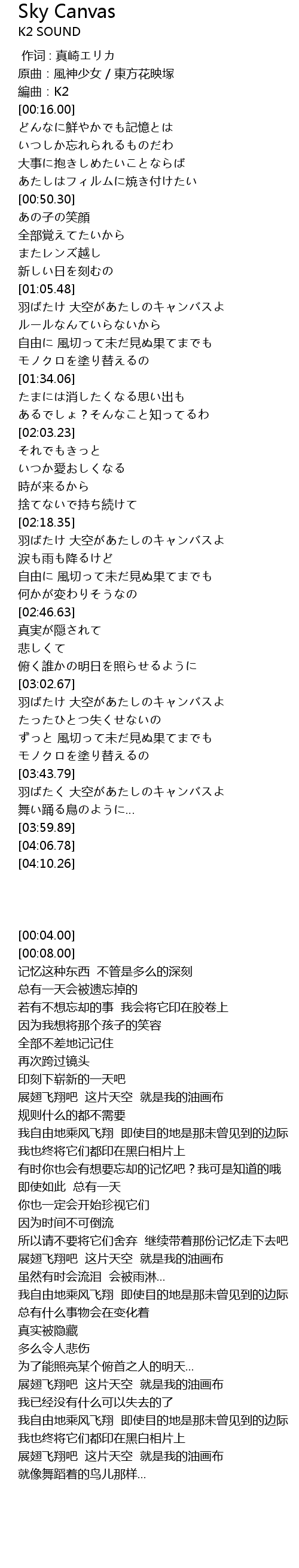 | [02:19.39] | 羽ばたけ 大空があたしのキャンバスよ |