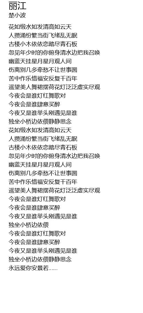 | [02:16.245] | huā rú duàn shuǐ rú fā qīng gāo rú yún tiān |