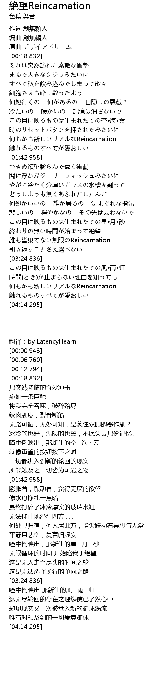 | [03:06.359] | shuí jiē guǒ wú xiàn Reincarnation |