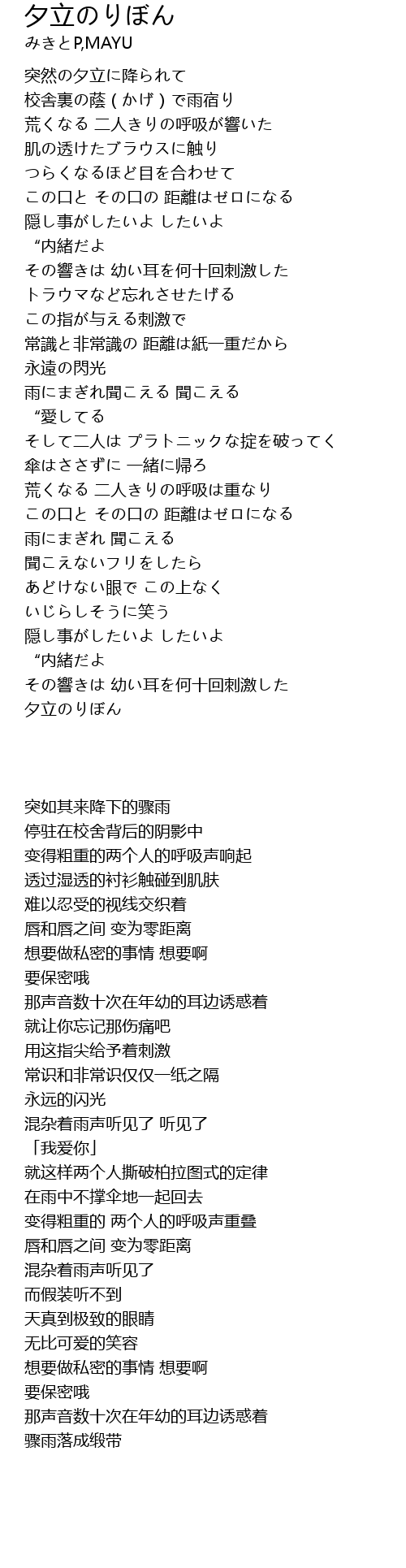 | [00:29.45] | 校舎裏の蔭(かげ)で雨宿り |