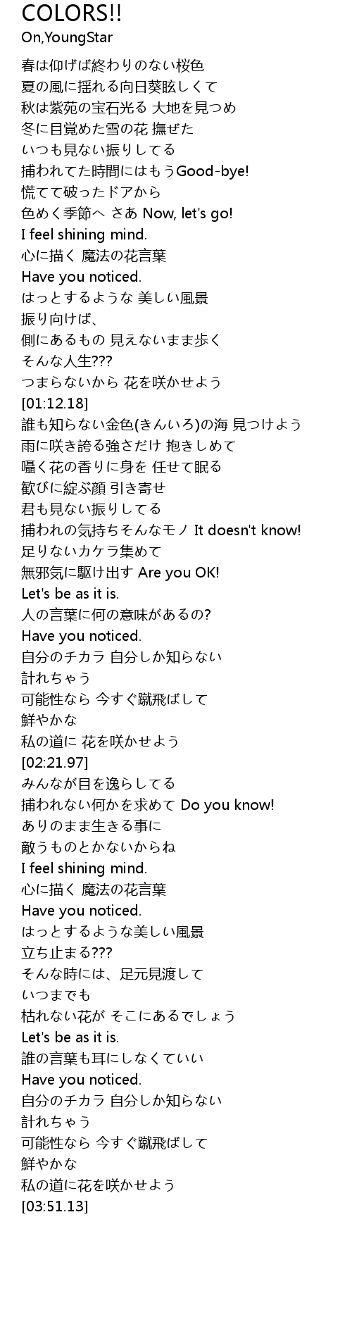 | [00:49.46] | 色めく季節へ さあ Now, let's go! |