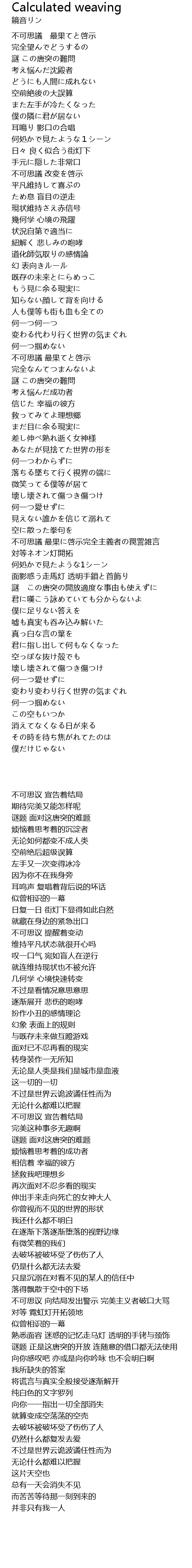 | [03:48.150] | 不可思議 最果に啓示完全主義者の罠詈雑言 |