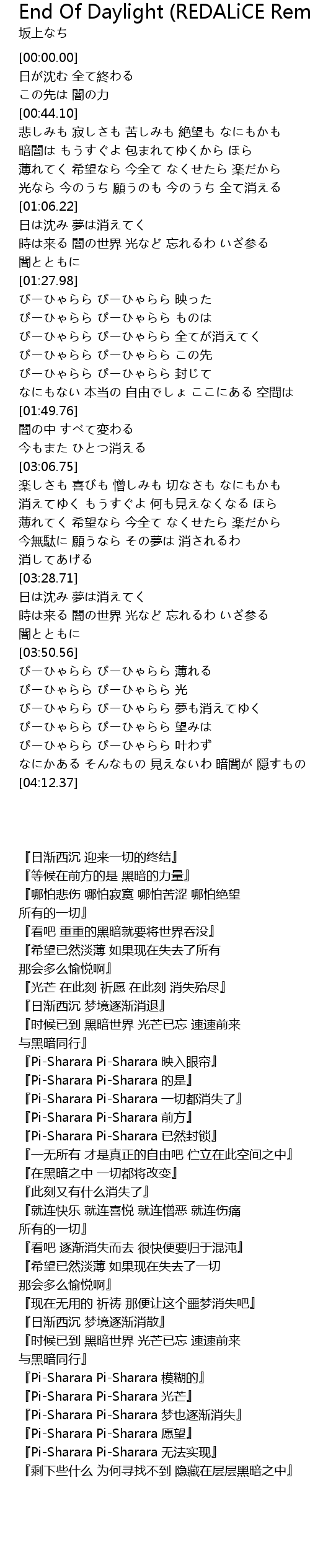 | [00:22.45] | 日が沈む 全て終わる |