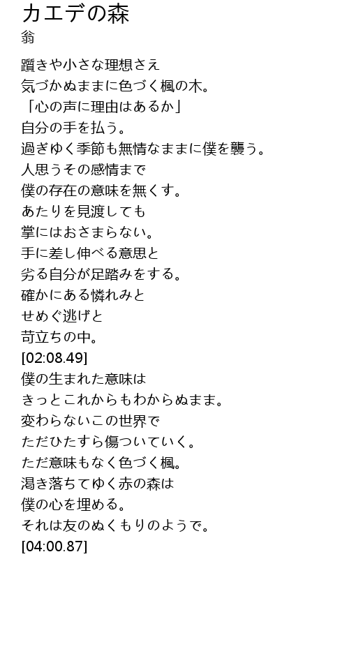 | [03:35.79] | 渇き落ちてゆく赤の森は |