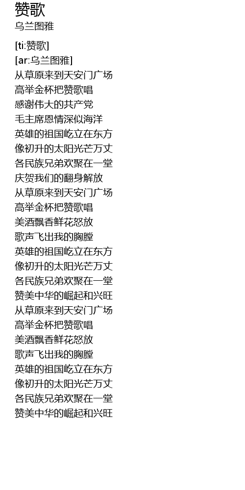 | [01:45.734] | cóng cǎo yuán lái dào tiān ān mén guǎng chǎng |