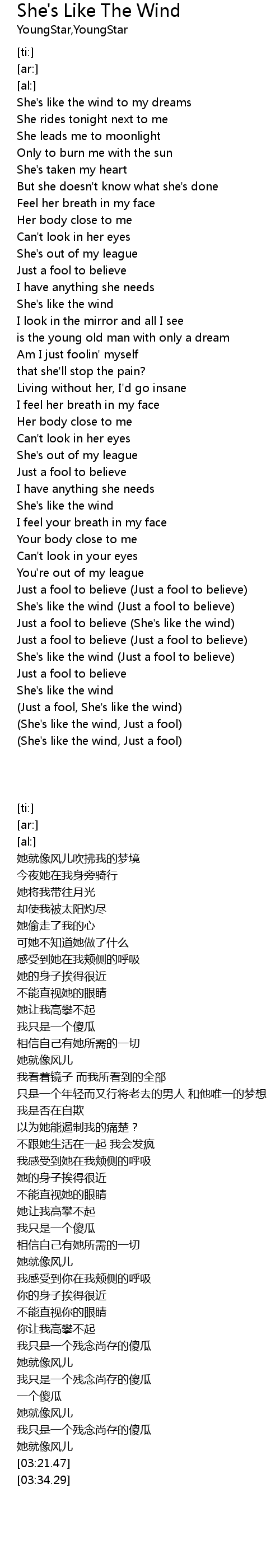 | [03:21.47] | (Just a fool, She's like the wind) |