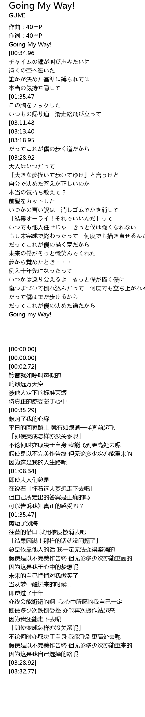 | [00:35.29][01:35.47] | Going my way! Don' t be afraid! |