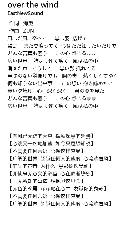 | [00:39.000] | 凪ぃだ風 空へと 黒ぃ羽 広げて |