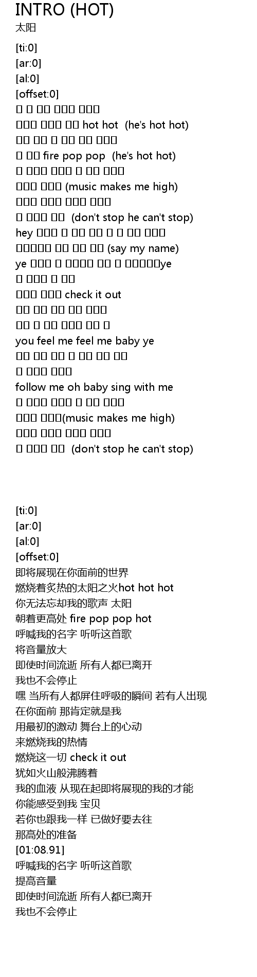 | [00:11.22] | 뜨거운 태양의 불이 hot hot (he's hot hot) |