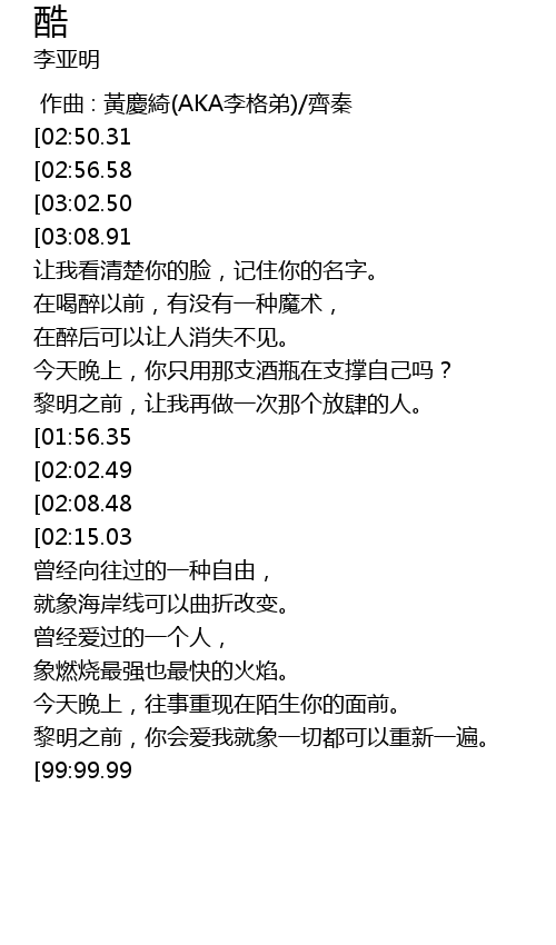 | [04:19.02][02:50.31][00:52.99][00:27.30] | 什么时候学会的一种东西叫做酷, |