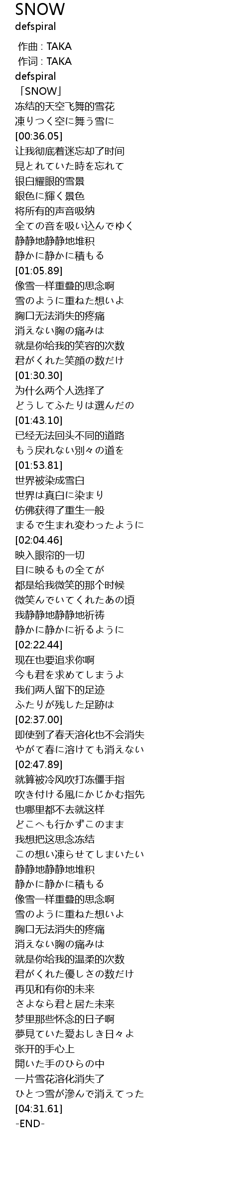 | [04:22.45] | ひとつ雪が滲んで消えてった |