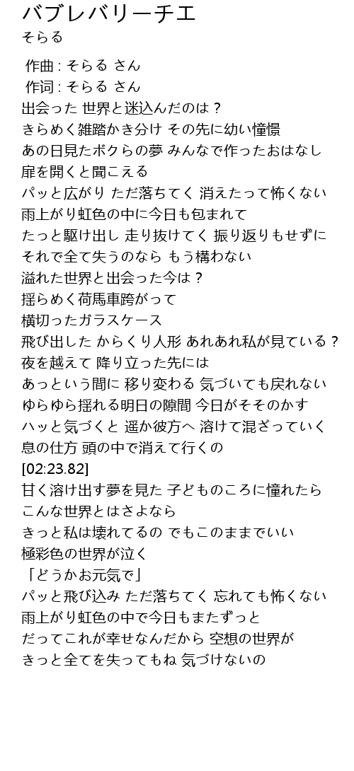 | [03:13.72] | 雨上がり虹色の中で今日もまたずっと |