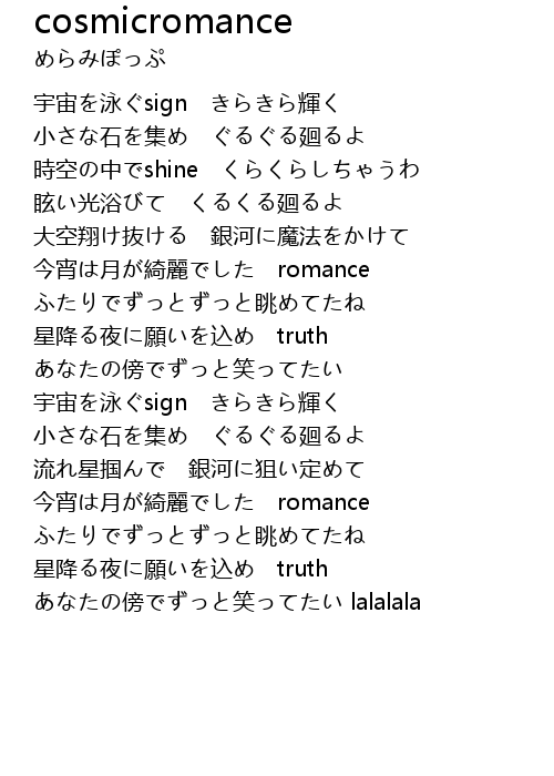 | [00:25.535] | 宇宙を泳ぐsign きらきら輝く |