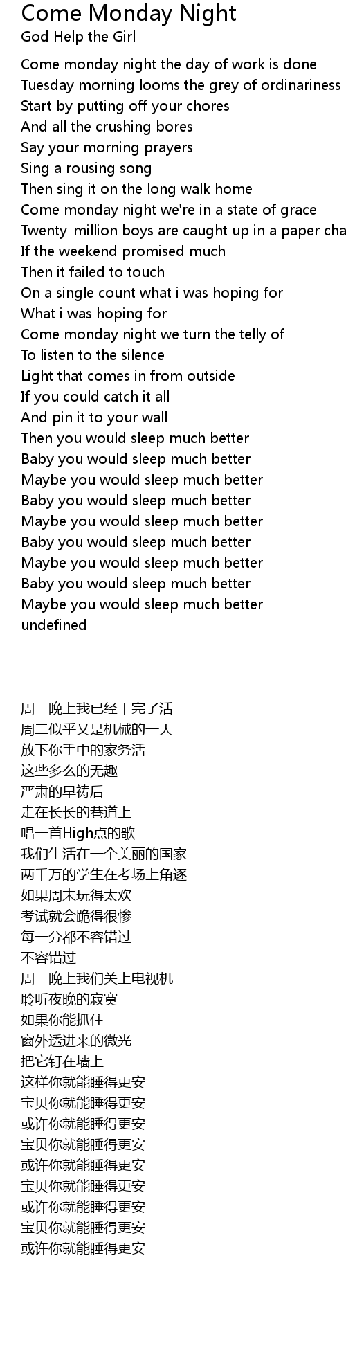 Come monday night the day of work is done |
